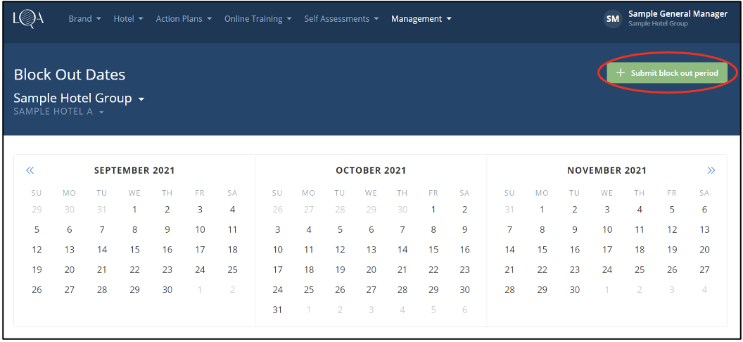 Please note: that if you wish to submit a block out range of over 60 days, this should be done by contacting our admin team, info@leadingquality.com. This action cannot be completed via the LQA platform.
