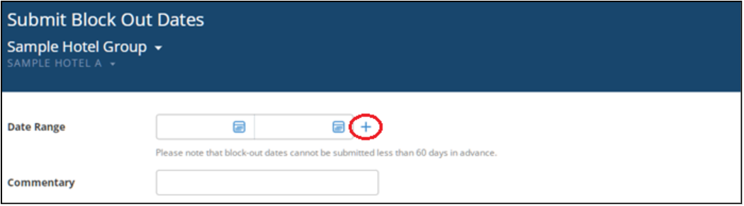 - Complete the date range fields with the new Block Out dates and provide us with any relevant commentary (if applicable) in the corresponding text box. To note, these dates cannot be submitted within 60 days of the current date: