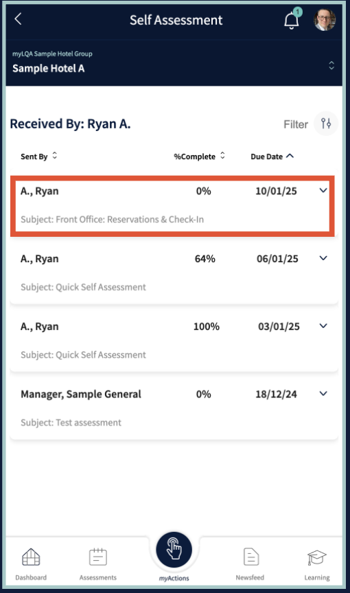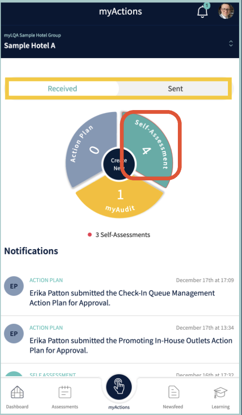 Return to the myActions button to view the number of open Self Assessment, click on the Self Assessment section to see the full list of Self Assessments.
